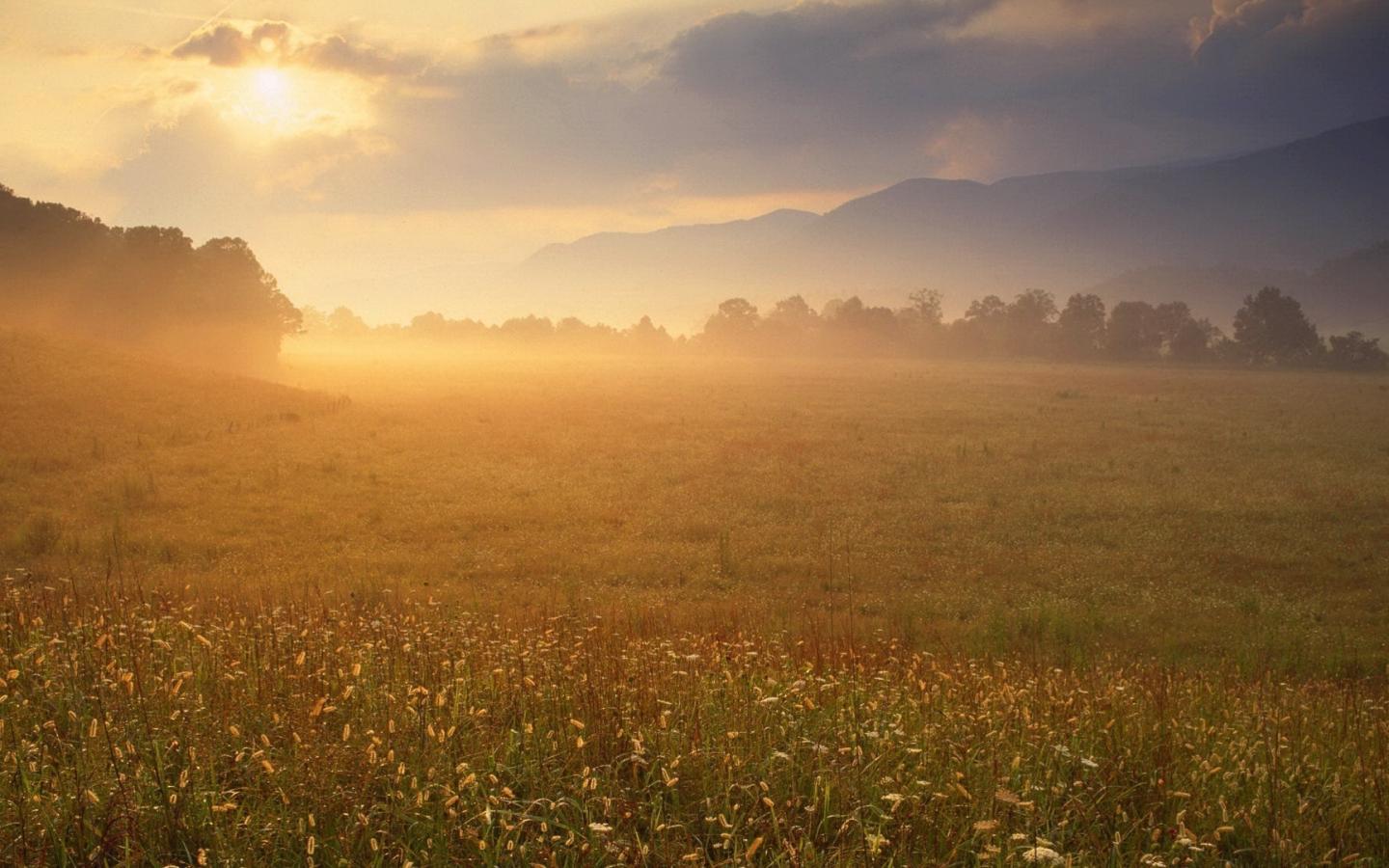 Поле, туман, деревья, солнце обои для рабочего стола, картинки, фото, 1440x900. | ||||||||||||||||